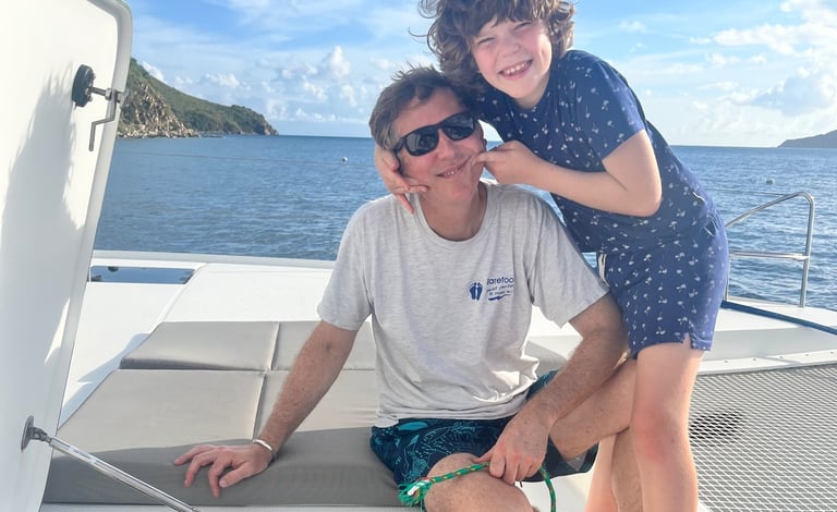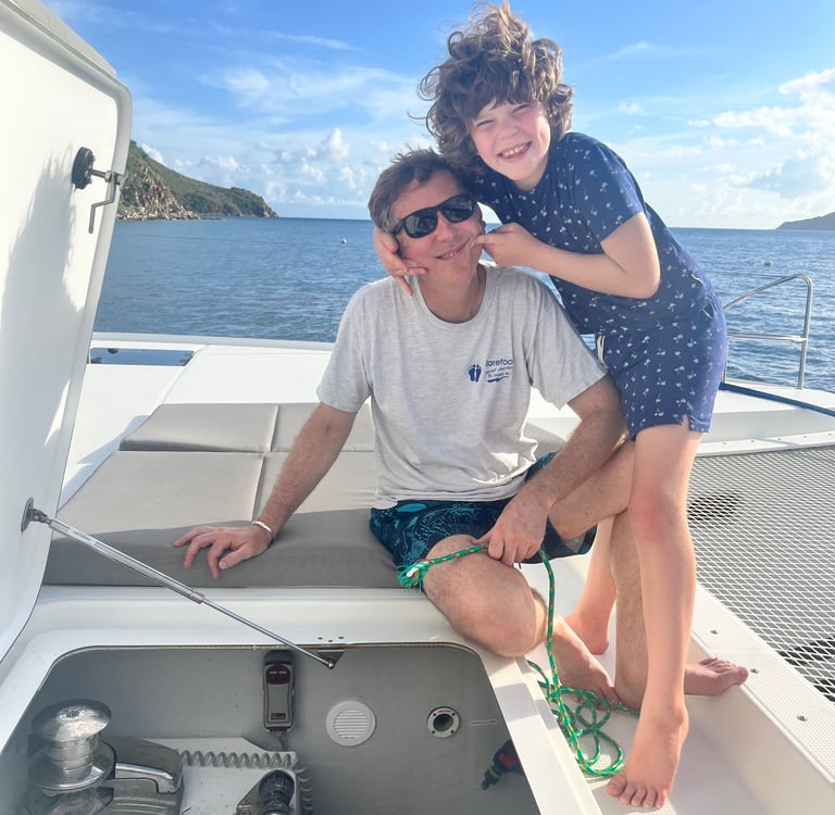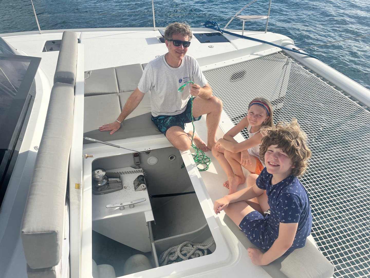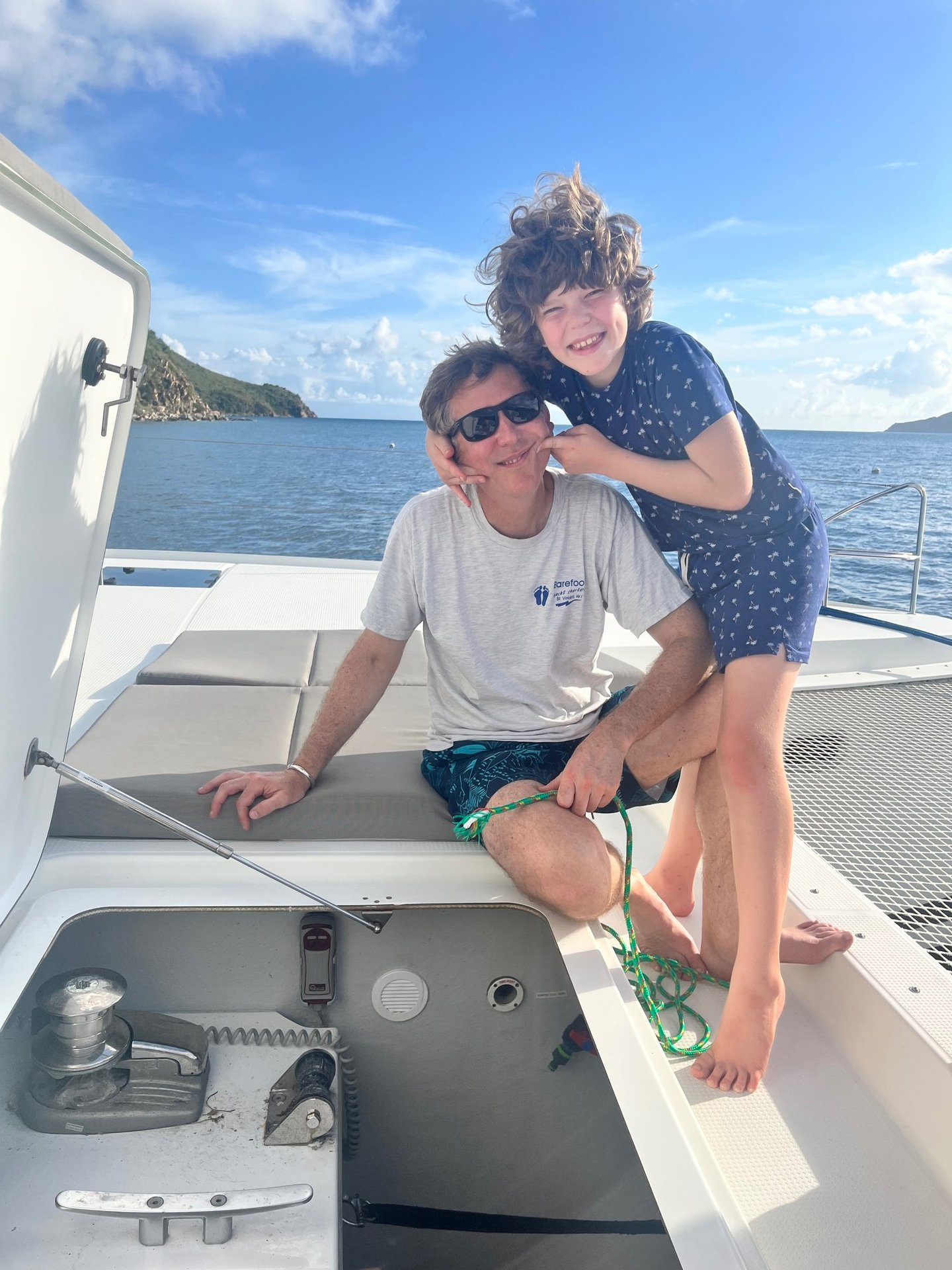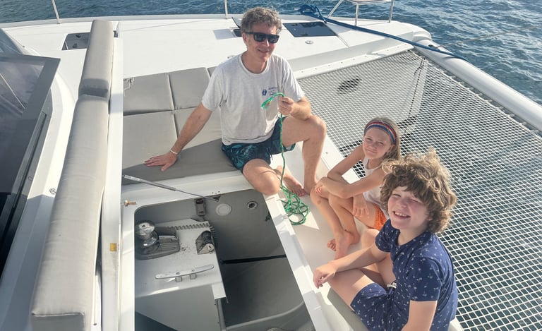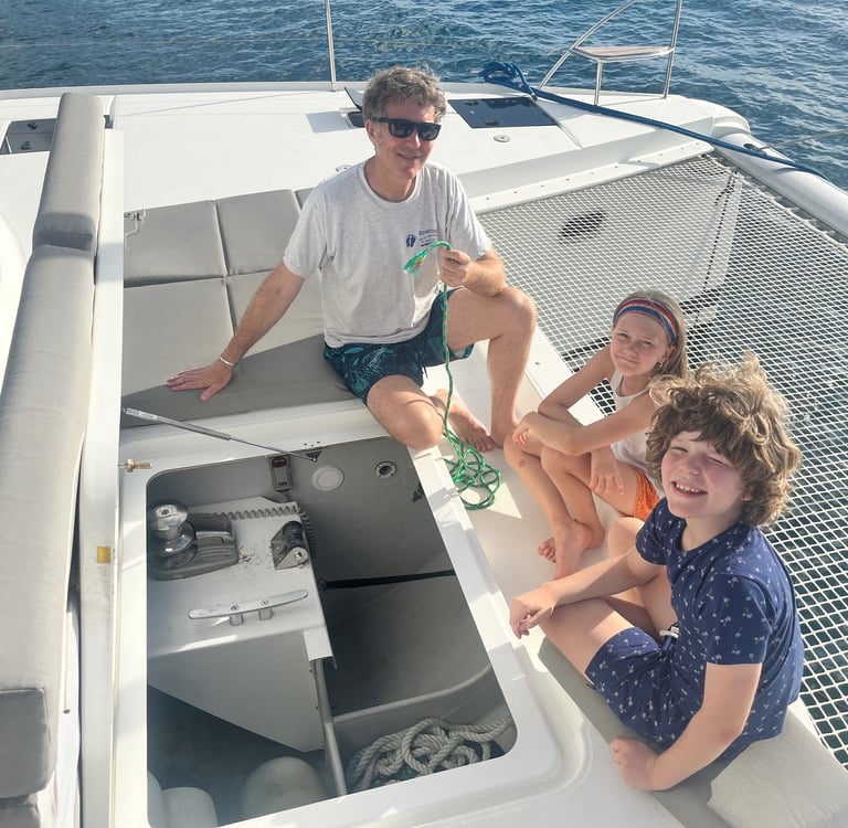 Wir hörten auf zu lachen und fuhren dann los, nachdem wir noch einige E-Mails verschickt und neue mit Cat Co und jemandem, der unser Ruder reparieren sollte, ausgetauscht hatten. Wir waren auf dem Weg zu einer versteckten Bucht in der Nähe von Norman Island (auch bekannt als Schatzinsel, da Gerüchten zufolge Piraten sie im 18. Jahrhundert als Versteck für ihre Schätze nutzten). Wir fanden einen schönen Platz und bereiteten uns darauf vor, den Anker zu werfen. Doch dann die Überraschung: Unsere Ankerwinde funktionierte nicht! Sie war blockiert, und die Ankerkette war straff gespannt und ließ sich nicht bewegen. Die Ankerwinde ist die Maschine, mit der wir den Anker absenken. Es war bereits gegen 16 Uhr, also mussten wir einen guten Platz für die Nacht finden. Meine Mutter übernahm das Steuer, während mein Vater versuchte, die Ankerwinde wieder in Gang zu bringen. Wir fuhren los in Richtung der nahegelegenen White Bay, wo es angeblich Bojen gab, an denen wir das Boot festmachen konnten, ohne den Anker zu benutzen. Unterwegs versuchten wir, die Ankerwinde zu reparieren. Für den Fall, dass sich der Anker löste, befestigte mein Vater einen Ankerhaken, um ihn zu sichern. Als wir schon über drei Viertel des Weges nach White Bay zurückgelegt hatten, funktionierte die Ankerwinde plötzlich wieder, und die Kette begann sich zu bewegen. Für einen kurzen Moment – vielleicht sogar weniger – jubelten wir! Doch aufgrund des Gewichts des Ankers und der Schwerkraft rutschte der Anker immer weiter ab… und ab… und ab. Meine Mutter schaltete den Motor in den Leerlauf. Wir sahen zu, wie der Anker, die gesamte Kette und sogar das Ende des Seils (das Stück Seil am Ende der Ankerkette, das am Boot befestigt ist, damit die Kette nicht versehentlich komplett ins Wasser fällt) abrissen und im Wasser verschwanden. Dann war es still. Unser Anker lag nun weit unter unserem Boot. Genau, unser Anker und die gesamte Kette waren irgendwo unter uns und nicht mehr an Bord. Wir liegen jetzt in White Bay vor Anker, bis Dienstag, wenn wir wieder nach Sopers Hole fahren, um einen neuen Anker zu besorgen und einige andere Dinge reparieren zu lassen. Das zeigt mal wieder: Wenn das Leben dir Zitronen gibt, mach Limonade draus – oder in unserem Fall: Wenn das Leben dir Bananen gibt, mach sofort Bananenbrot!