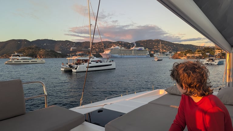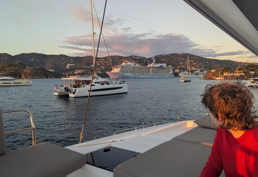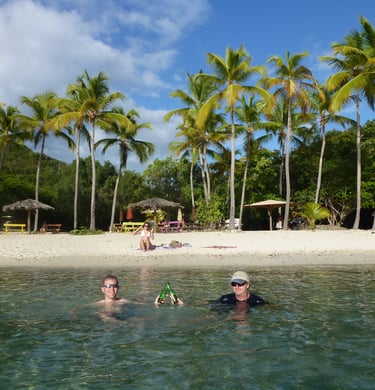 Honeymoon Bay has a special place for Cornelia and I, as we actually sailed there on our honeymoon many moons ago! At the time, it was a quiet, peaceful hidden gem. While still just as beautiful now, it has officially been "discovered," and was awash with people, boats, and a bar putting out some thumping music. We even saw a car-boat whizz by! All fun, but definitely a different vibe. We even had to fight two other boats to get one of the few remaining anchorages!